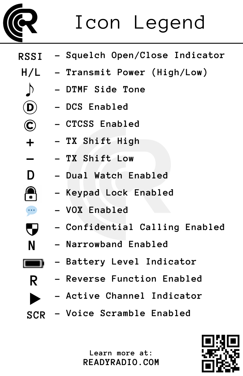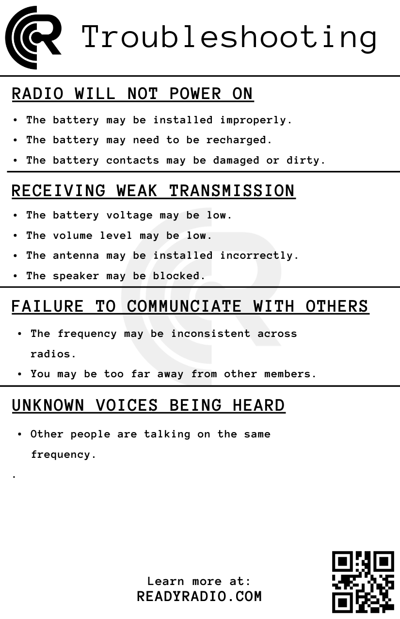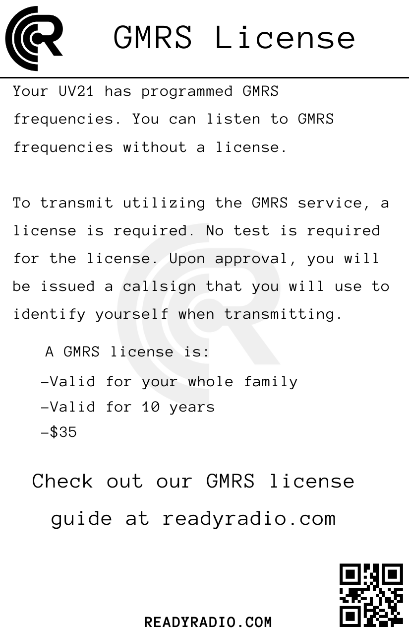 - Channels: Pre-programmed with standard channels - GMRS/FRS, MURS, NOAA, Emergency Channels, and repeaters based on your location.
