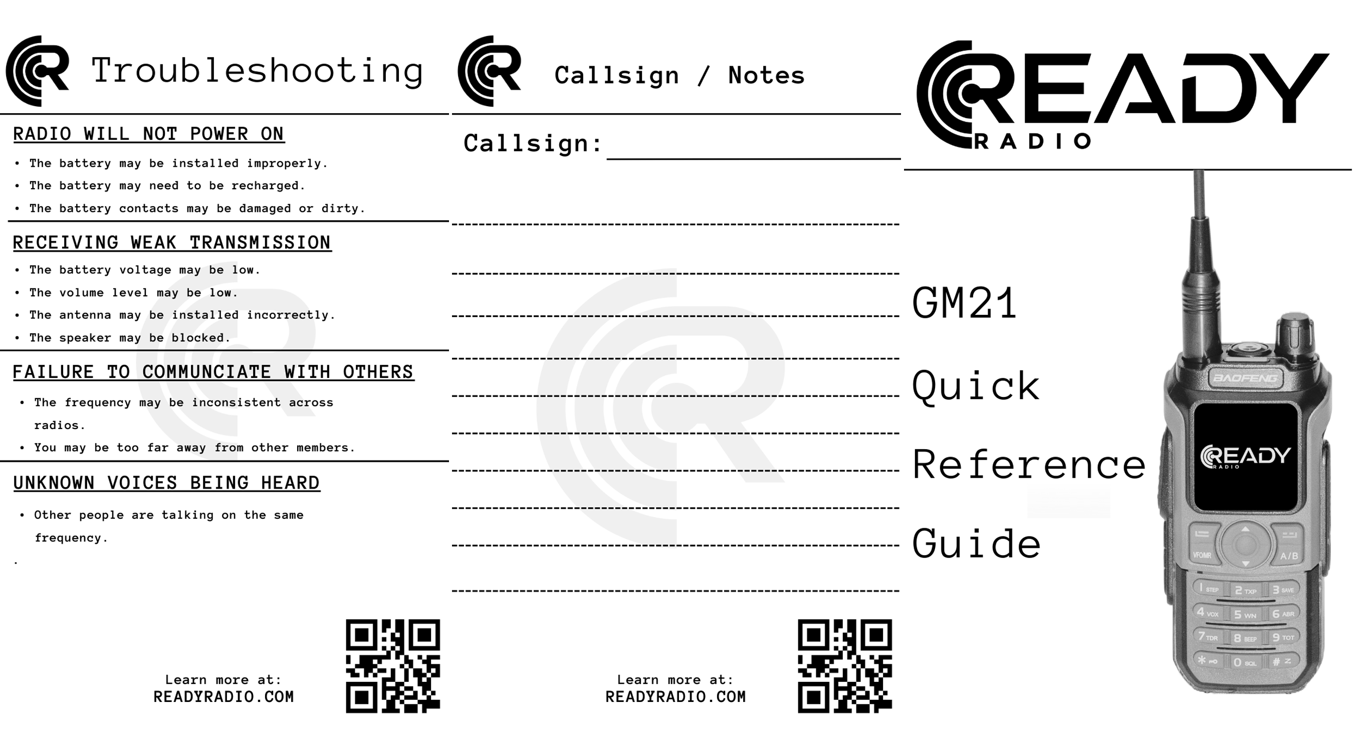 The Baofeng GM21 is a compact two-way radio designed for reliable communication in outdoor, tactical, and emergency scenarios. Custom repeaters allow this radio to transmit further than standard unprogrammed radios, combine with being fully unlocked this radio can achieve more than standard HAM radios. This kit features a ZBM2 Foul Weather Whip antenna for crystal-clear communications and range.